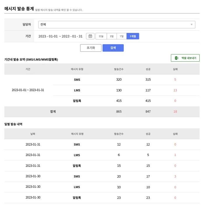 본 내용도 리뷰가 주제이듯 모든 일에는 리뷰 및 리포트가 가장 중요합니다. 고객에게 리뷰 등록 안내 메시지만 보낸다고 리뷰 등록이 자연스럽게 증가하고, 매출 상승까지 연결로 이어지게 될까요? 발송한 내용들은 통계와 함께 연결해서 확인해야 합니다. 배송이 많아 알림톡 발송을 실시간으로 해야 한다면 호스팅사에 연결된 알림톡을 사용하면 되겠지만, 우리가 원하는 것은 단발성 메시지로서의 알림톡 활용이 아닌 고객 데이터의 하나이므로 이 또한 히스토리로 남아야 합니다. 때문에 한곳에서 발송하고 한 곳에서는 발송 데이터를 쌓아 리포트를 해야하죠. 아래는 클라우드게이트의 알림톡, 메시지 발송 통계 화면입니다. 기간 별로 발송된 기록을 확인할 수 있습니다. 이 데이터로 매일 발송한 알림톡 데이터와 사이트에 등록된 일자별 리뷰 수를 기반으로 발송 대비 리뷰 등록률을 파악하여 평균 리뷰 등록률을 파악하고, 리뷰 등록률의 저조하다면 별도 프로모션을 통해 등록률을 높일 수 있도록 대안을 마련해야 합니다.