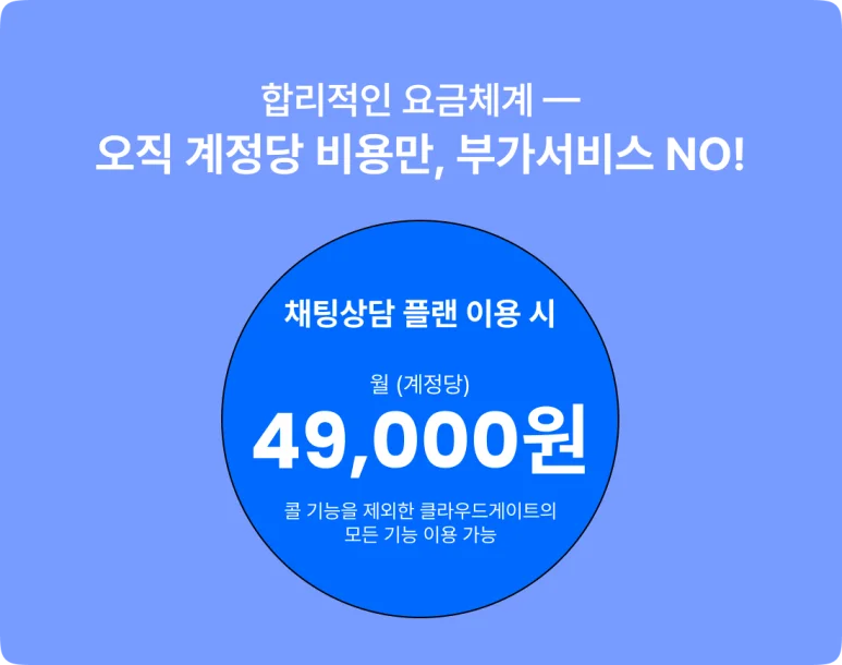 그리고 마지막으로 클라우드게이트는 위 모든 기능들을 계정당 비용으로 효율적인 고객상담솔루션 사용이 가능하니 지금 바로 상담 문의를 받아보세요! 클라우드게이트는 앞으로도 고객상담에 있엉 상담에 필요한 더 좋은 AI서비스가 런칭될 예정 이며 새로운 기능들이 업데이트 될 때 마다 발빠르게 소식을 전하도록 하겠습니다.