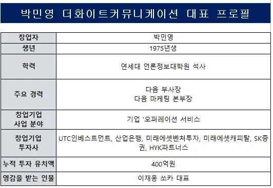 ‘다음커뮤니케이션(현재 카카오)’에서 승승장구하던 박민영 더화이트커뮤니케이션 대표(사진)는 이같은 개념이 시장 환경을 바꿔가는 과정에서 주도적인 역할을 해보고자 창업을 결정했다. 이에 사명에 ‘화이트’라는 단어를 넣어 온라인 커뮤니케이션 생태계를 깨끗하게 만들어보겠다는 의지를 담았다.